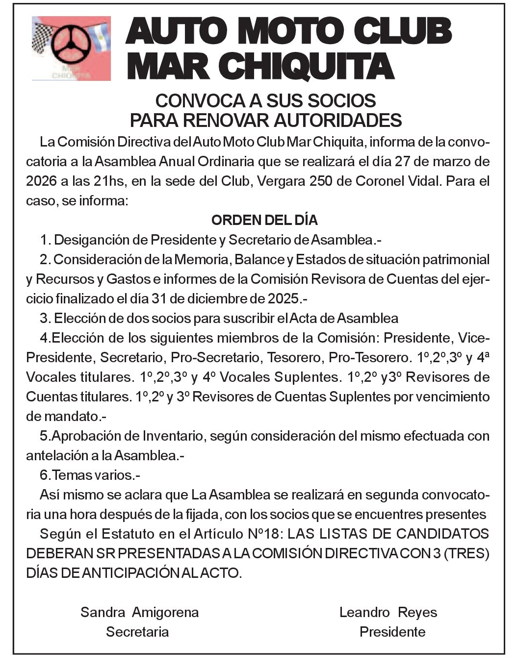 El Auto Moto Club Mar Chiquita tendría ya una fecha confirmada para la organización de las carreras del automovilsmo zonal en las categorías APAC, TC SUDESTE,...