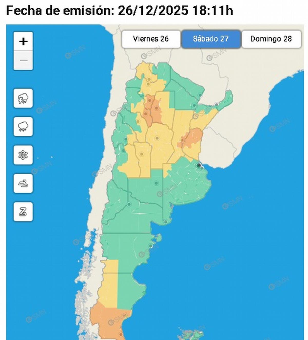 El aviso abarca a distintas zonas de la provincia de Buenos Aires, Córdoba, Santa Fe, Entre Ríos, Corrientes, Jujuy, Salta, Tucumán, Santiago del Estero, La Rioja, Mendoza, San Juan, Catamarca y San Luis.