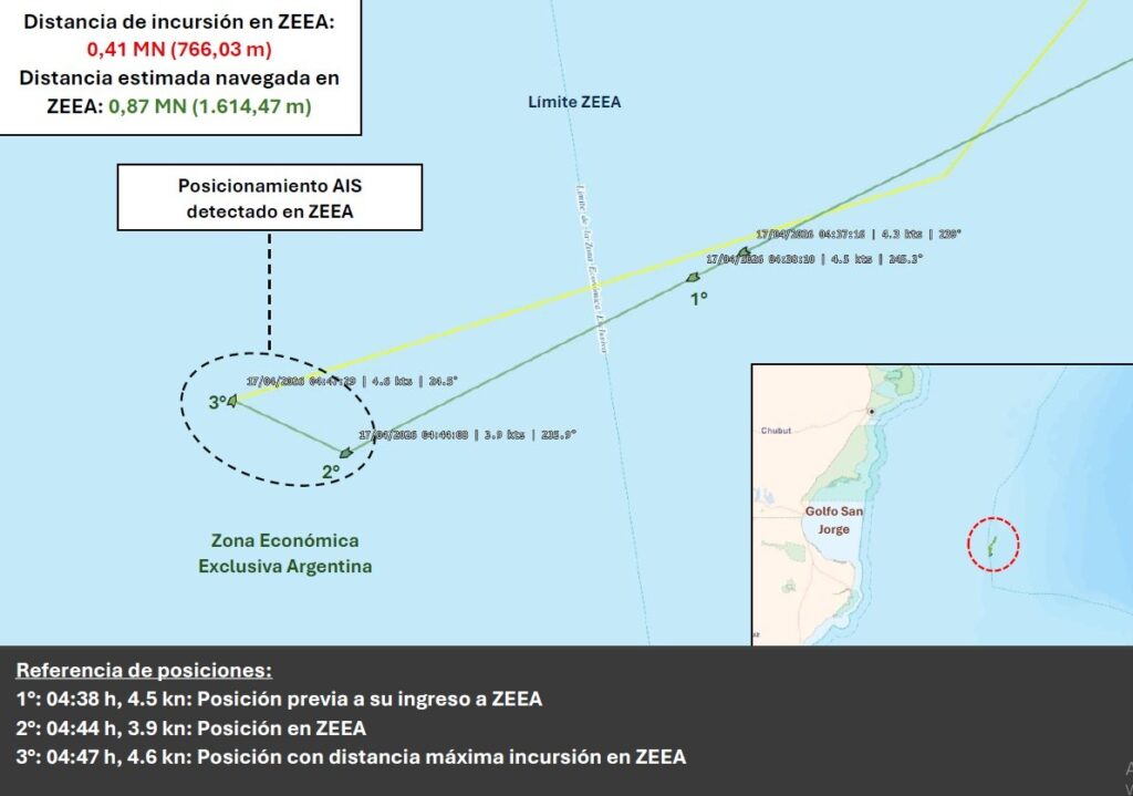 El citado buque, que realizó un ingreso de aproximadamente 700 metros dentro de la ZEEA, había zarpado de Uruguay el 25 de febrero y estaba en zona de pesca desde el 28 de febrero, al través de Cabo Dos Bahías, Chubut.