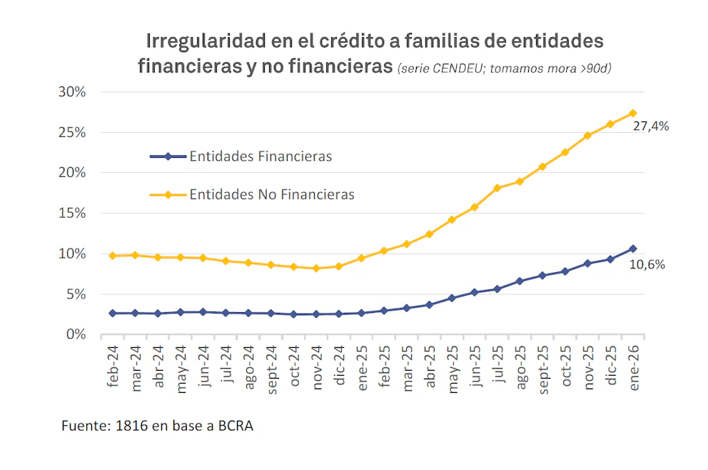 El informe de EcoGo señala que "la irregularidad en los créditos no bancarios muestra un crecimiento sostenido desde 2024, acelerando a fines de 2025". A partir de la desagregación de las carteras, el estudio muestra que el crédito no bancario totalizó 13,84 billones de pesos en enero de 2026.