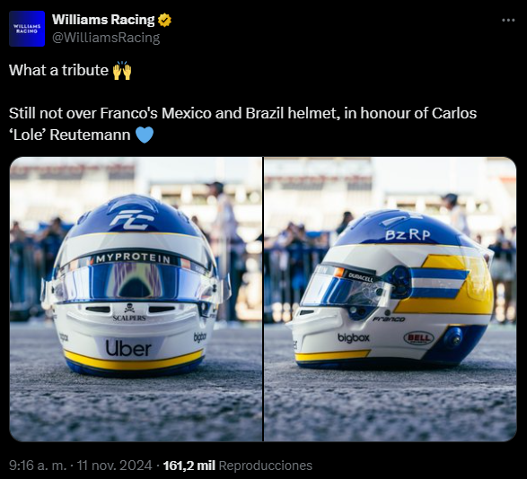 “Qué tributo. Aún no pude superar el casco de Franco en México y Brasil, en homenaje a Carlos ‘Lole’ Reutemann”, escribieron desde Williams y los seguidores argentino no tardaron en reaccionar al posteo. Se vieron distintos comentarios como: “Hermoso el casco de siempre” y “un grande el Lole, vamos Franco” .
