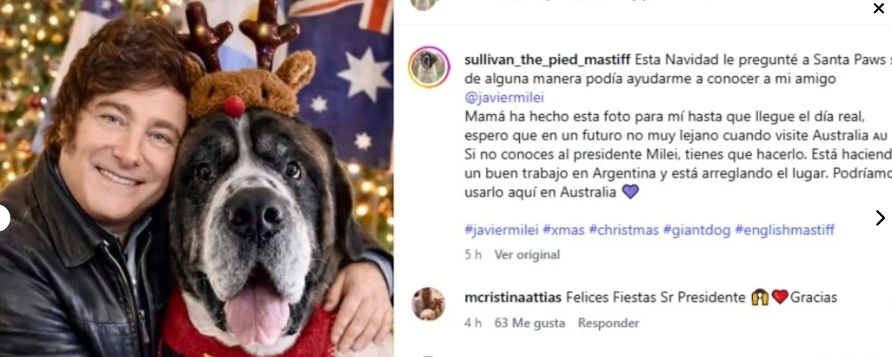 De todas formas, el libertario compartió en su Instagram personal una imagen conmemorativa de navidad publicada originalmente por Sullivan the Pied Mastiff, un famoso mastín de Australia, popular en esa red social donde sus personas a cargo documentan su vida, y que se hizo viral en la Argentina por una peculiar amistad con Javier Milei, quien le envió regalos como un busto presidencial y mensajes de voz, generando un intercambio amistoso entre el perro influencer y el presidente.