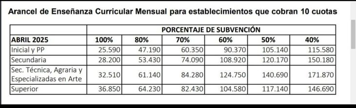 Los nuevos valores se aplicarán en las boletas que llegarán en los primeros días de abril en establecimientos de los niveles inicial, primaria, secundaria, técnica y agraria y superior de la Provincia son los siguientes: