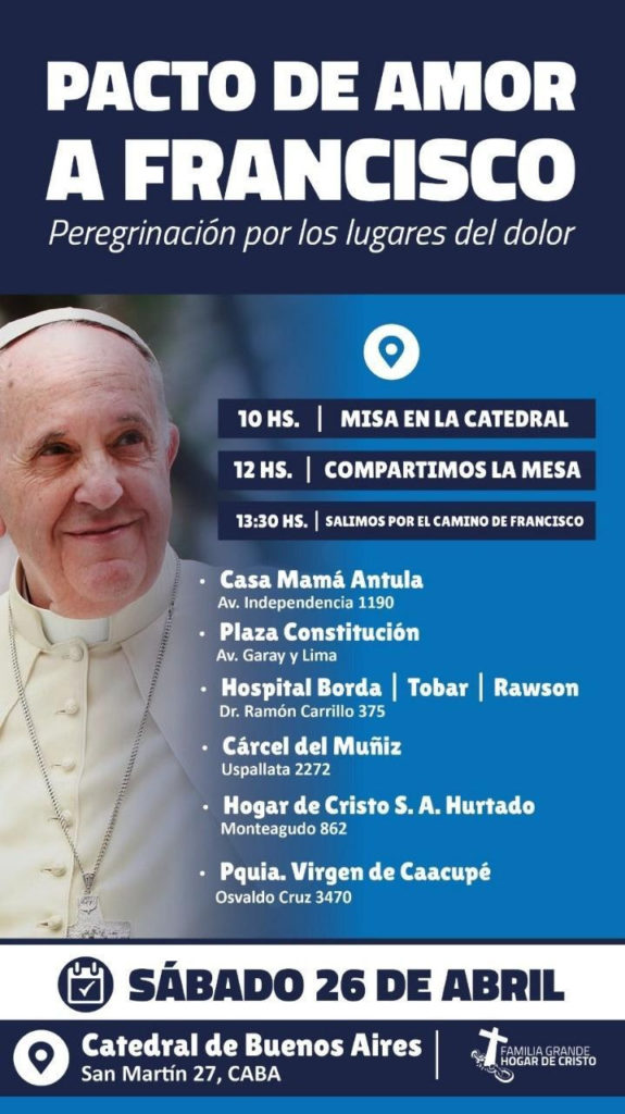 Este sábado 26 de abril de 2025 —ya entrado el mediodía y luego de celebrada la Misa en la Catedral de Buenos Aires en la que rezará por el eterno descanso del Papa Francisco— con las comunidades parroquias y capillas de barrios populares y villas, junto a la Familia Grande Hogar de Cristo el Equipo de Sacerdotes de Barrios Populares y Villas de Argentina y Familia Grande Hogar de Cristonos compartir con los fieles un almuerzo en Plaza de Mayo.