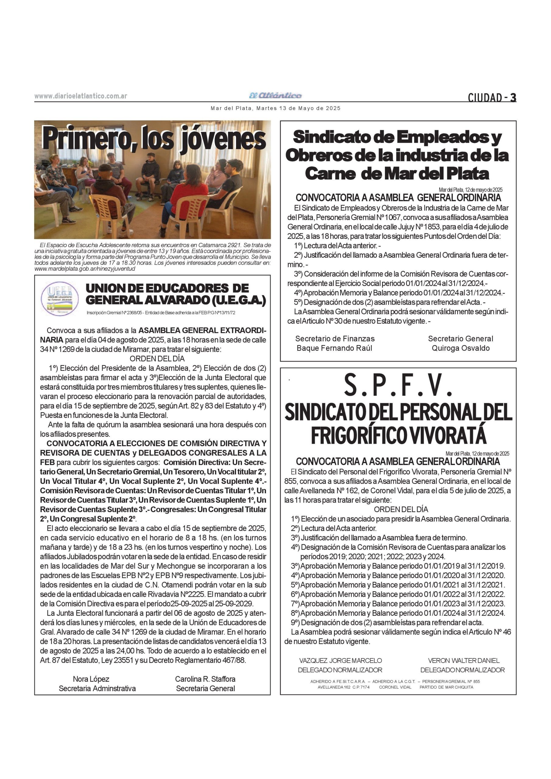 Comerciales Convocatoria Sindicato del Personal del Frigorífico Vivorata 13 de mayo de 2025 p3avisos13.5.25FDescarga Temas Relacionados Siguiente Convocatoria Unión De Educadores De General Alvarado (U.E.G.A.) No te pierdas Convocatoria Sindicato de Empleados y Obreros de la Industria de la Carne de Mar del Plata Comerciales Convocatoria Sindicato de Luz y Fuerza Gral. Pueyrredón p3-lyf-11-12-25bDescarga Continuar Leyendo Comerciales Convocatoria Educadores de Mar Chiquita p3-mch-4-12-25Descarga Continuar Leyendo Comerciales Edicto ciudadanía Moskot Olena p3-avisos-26.11.25_FDescarga p3-aviso-27.11.25Descarga Continuar Leyendo