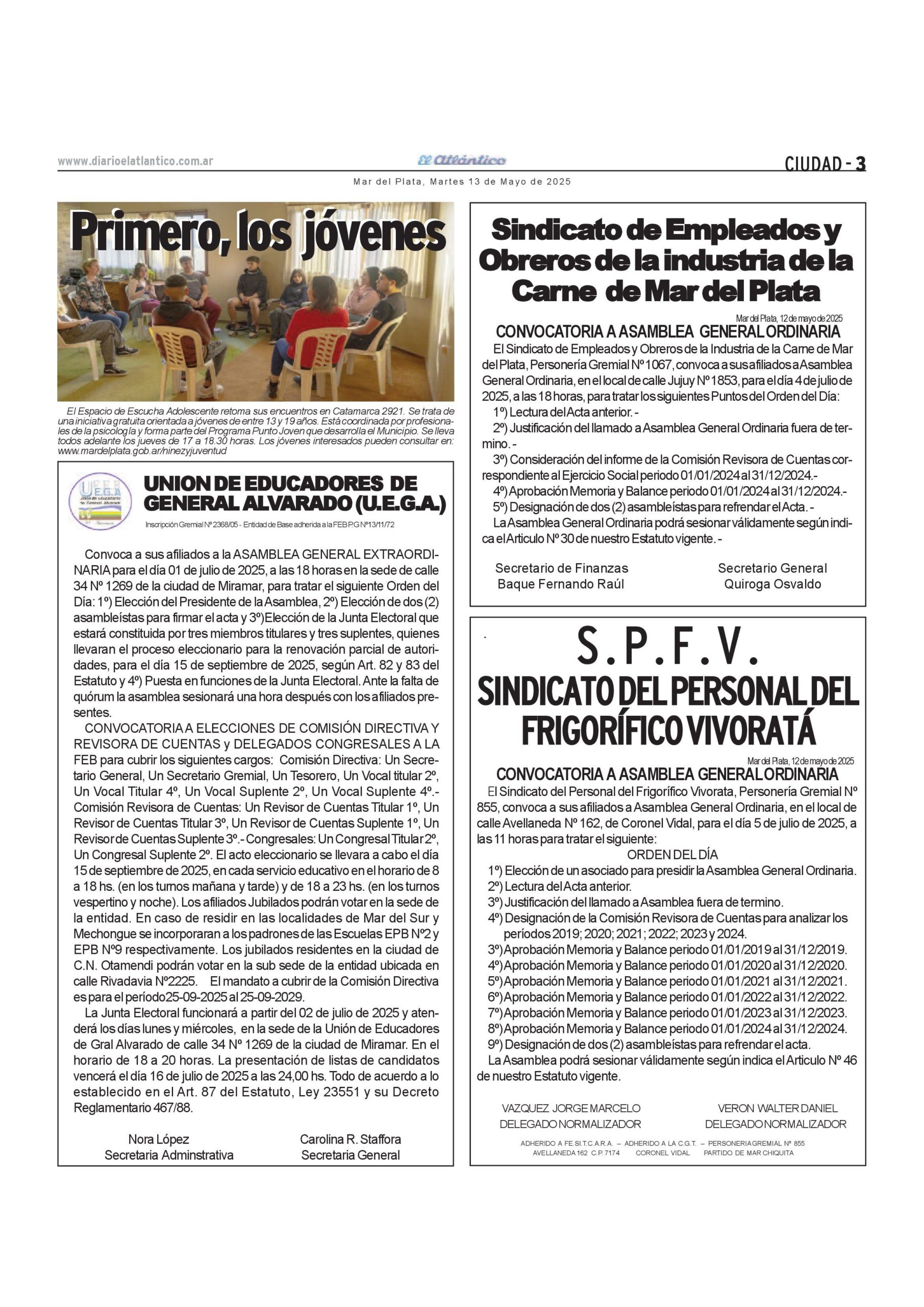 Comerciales Convocatoria Unión De Educadores De General Alvarado (U.E.G.A.) 13 de mayo de 2025 p5avisos13.5.25FINAL_Descarga Temas Relacionados Siguiente Convocatoria Cooperativa De Trabajo CURA Limitada No te pierdas Convocatoria Sindicato del Personal del Frigorífico Vivorata Comerciales Convocatoria Sindicato de Luz y Fuerza Gral. Pueyrredón p3-lyf-11-12-25bDescarga Continuar Leyendo Comerciales Convocatoria Educadores de Mar Chiquita p3-mch-4-12-25Descarga Continuar Leyendo Comerciales Edicto ciudadanía Moskot Olena p3-avisos-26.11.25_FDescarga p3-aviso-27.11.25Descarga Continuar Leyendo