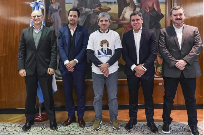 El ministro de Economía, Luis Caputo, siguió celebrando este lunes el triunfo obtenido por La Libertad Avanza (LLA) en las elecciones porteñas y sorprendió al mostrarse en una reunión oficial con una remera que tiene una caricatura del presidente Javier Milei.Fue al recibir a la plana mayor de Ford Latinoamérica, que le fue a anunciar que volverán a incrementar su producción en la Argentina.