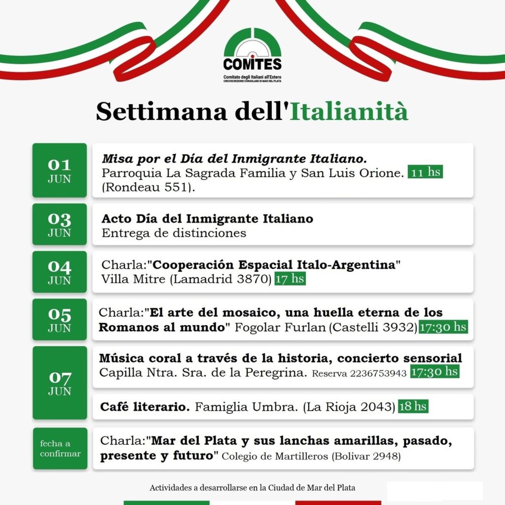 El Comité de los Italianos en el Exterior ( Com.It.Es.) de Mar del Plata, anuncia la realización de la III Edición de la “Settimana dell´Italianitá”, una semana destinada a fortalecer la italianidad en coincidencia con los festejos del Día de la República Italiana (2 de junio) y Día Nacional del Inmigrante Italiano (3 de junio).
