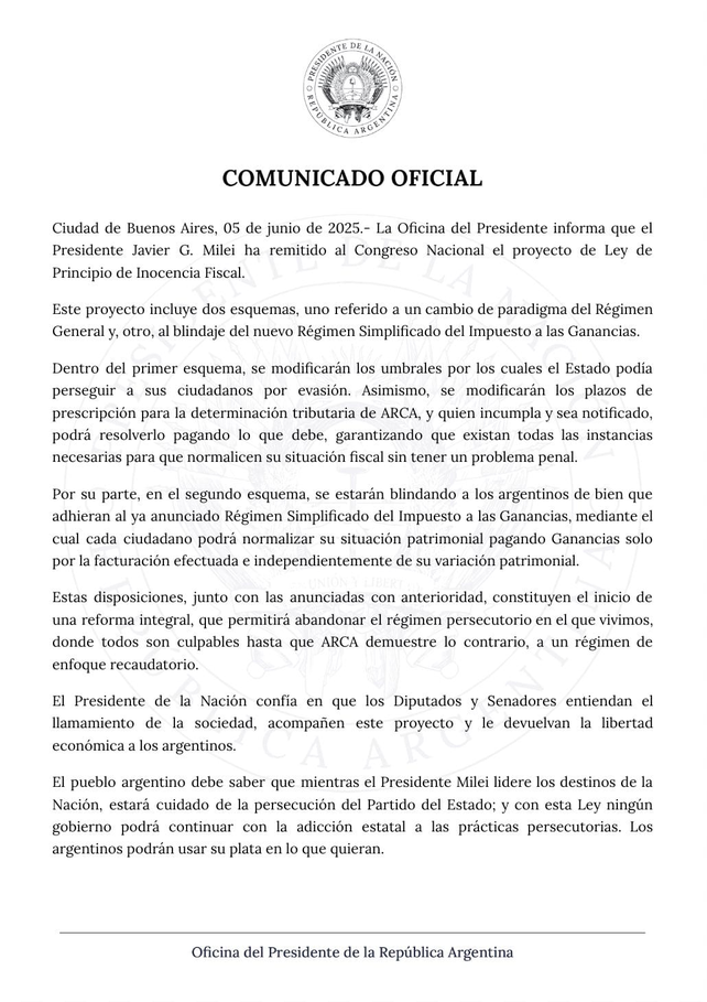 Por su parte, Espert afirmó que “el contenido de este Proyecto consiste en un cambio de régimen en materia tributaria”, y que con el mismo se busca “abandonar el régimen persecutorio en el que la legislación y la ex-Afip presuponían que todos éramos culpables” y pasar a “un enfoque recaudatorio donde todos somos inocentes, salvo que Arca demuestre lo contrario