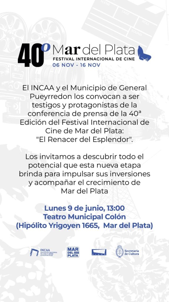 Este lunes 9 a las 13:00 en el Teatro Municipal Colón (Hipólito Yrigoyen 1665) se llevará adelante la presentación oficial de la 40ª edición del Festival Internacional de Cine de Mar del Plata: “El Renacer del Esplendor”.