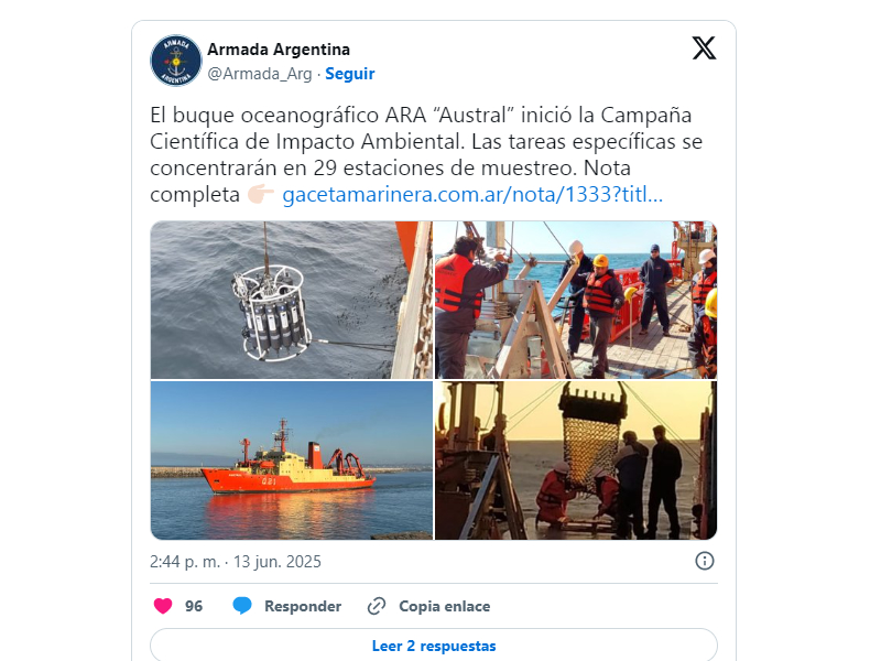 El buque oceanográfico ARA “Austral” zarpó desde la Base Naval Mar del Plata, con el objetivo de realizar un Estudio de Impacto Ambiental (EsIA) en la denominada Cuenca Argentina Norte, que abarca las costas de la provincia de Buenos Aires y de la provincia de Río Negro.