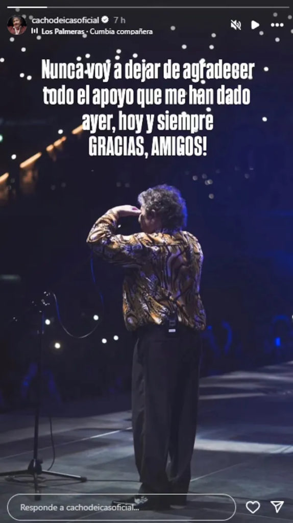 Cacho acompañó su publicación con la canción “Cumbia compañera”, qué expresa: “Cumbia, compañera de tantas noches llenas de encanto. Bórrame esta pena que me tortura, que me arrebata. Llévame contigo. Llévame muy lejos, que entre tus senderos de melodías quiero olvidar”.