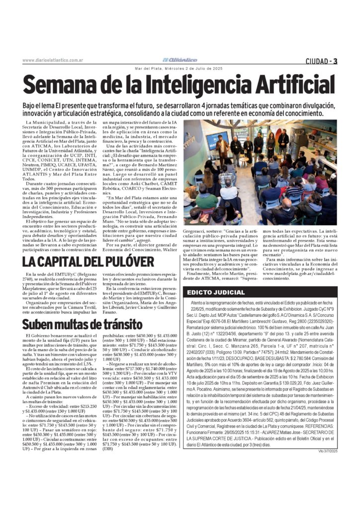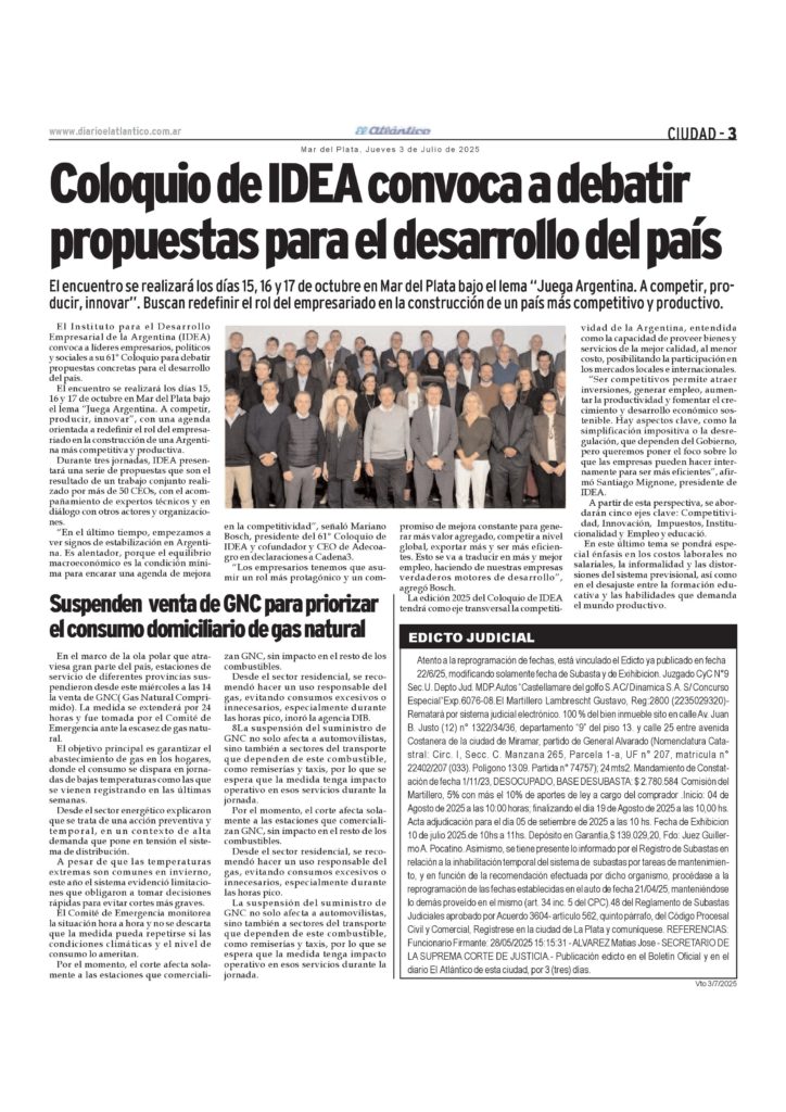 Comerciales Edicto subasta/quiebra, Autos “Castellamare del golfo S.A C/ Dinamica S.A. S/ Concurso Especial “Exp.6076-08. 2 de julio de 2025 p3-edic1.7.251de3Descarga p3-edicto2.7.25Descarga p3-edicto3.7.25-1Descarga Temas Relacionados Siguiente Convocatoria Comisión Directiva del Club Náutico Mar del Plata No te pierdas Convocatoria Asociación Cooperadora de la Escuela de Ganadería «Nicanor Ezeyza» Comerciales Convocatoria Sindicato de Luz y Fuerza Gral. Pueyrredón p3-lyf-11-12-25bDescarga Continuar Leyendo Comerciales Convocatoria Educadores de Mar Chiquita p3-mch-4-12-25Descarga Continuar Leyendo Comerciales Edicto ciudadanía Moskot Olena p3-avisos-26.11.25_FDescarga p3-aviso-27.11.25Descarga Continuar Leyendo
