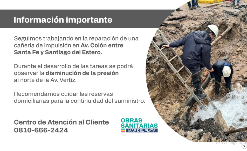 Personal de Obras Sanitarias Sociedad de Estado (OSSE) trabaja a destajo por estas horas en la reparación de una de las cañerías troncales de la ciudad, emplazada sobre avenida Colón entre Santiago del Estero y Santa Fe, lo que ha generado una baja en la presión en el servicio de agua potable en distintos barrios.