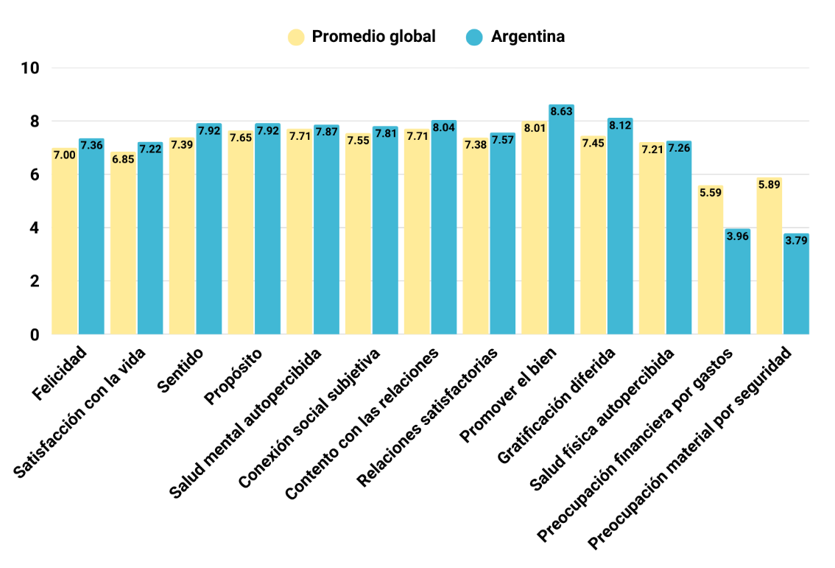 El estudio muestra que los adultos argentinos presentan niveles superiores al promedio internacional en dimensiones vinculadas con el bienestar psicológico, las relaciones sociales y el carácter prosocial. En contraste, las dos dimensiones donde el país queda por debajo del promedio global corresponden a la estabilidad económica y material, reflejando mayores preocupaciones por ingresos y seguridad financiera.
