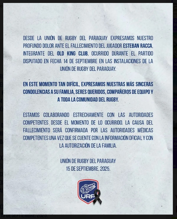 Desde la URP lanzaron un comunicado en el que expresan “nuestro profundo dolor ante el fallecimiento del jugador Esteban Racca. En este momento tan difícil, expresamos nuestras más sinceras condolencias a su familia, seres queridos, compañeros de equipo y a toda la comunidad del rugby. Estamos colaborando estrechamente con las autoridades competentes desde el momento de lo ocurrido”.