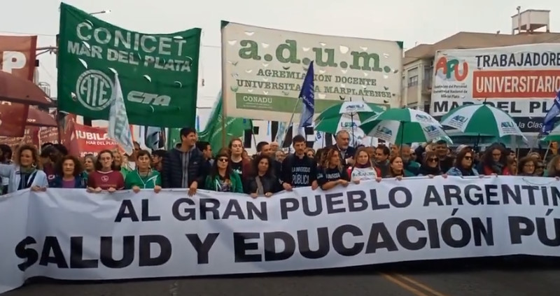 Mar del Plata también marchó en protesta por el financiamiento de la educación universitaria y la salud. En efecto, dirigentes y afiliados de los gremios ADUM, APU, FUM, ATE y CICOP se movilización junto a autoridades de la Universidad Nacional de Mar del Plata (UNMDP) en el marco de la protesta nacional en rechazo  al veto presidencial sobre la Ley de Financiamiento Universitario.