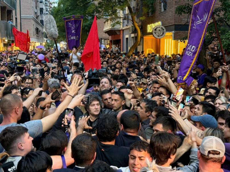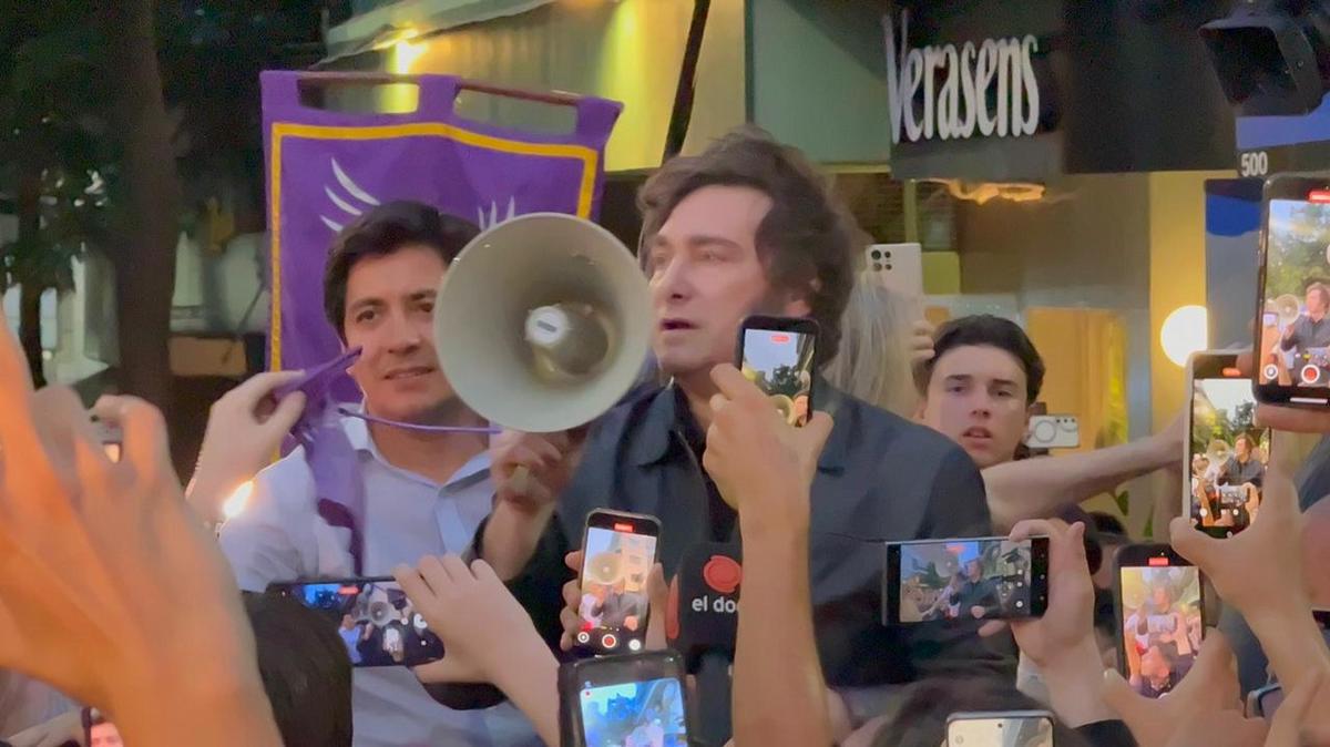 Rodeado por una gran cantidad de militantes libertarios, el mandatario dio un mensaje con un megáfono sobre la parte trasera de una camioneta, junto a Karina Milei y el candidato de la Libertad Avanza a diputado nacional por Córdoba Gonzalo Roca.