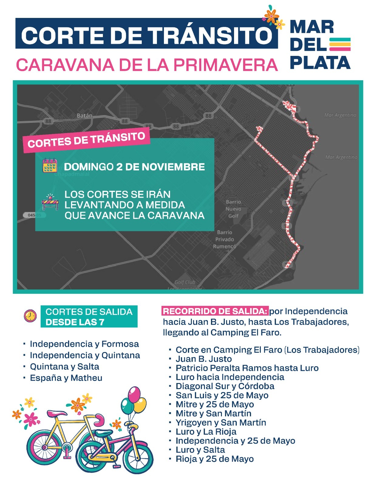 La Municipalidad de General Pueyrredon, a través de la Dirección de Tránsito, informa sobre los cortes de tránsito que se llevarán a cabo este domingo 2 con motivo de la 65° edición de la Caravana de la Primavera.