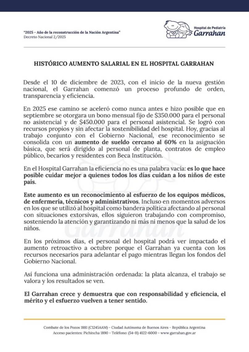 Sobre el final del comunicado se aclaró que en los próximos días el personal del centro médico podrá ver impactado el aumento retroactivo a octubre y destacaron que “el Garrahan ya cuenta con los recursos necesarios para adelantar el pago mientras llegan los fondos del Gobierno Nacional”.