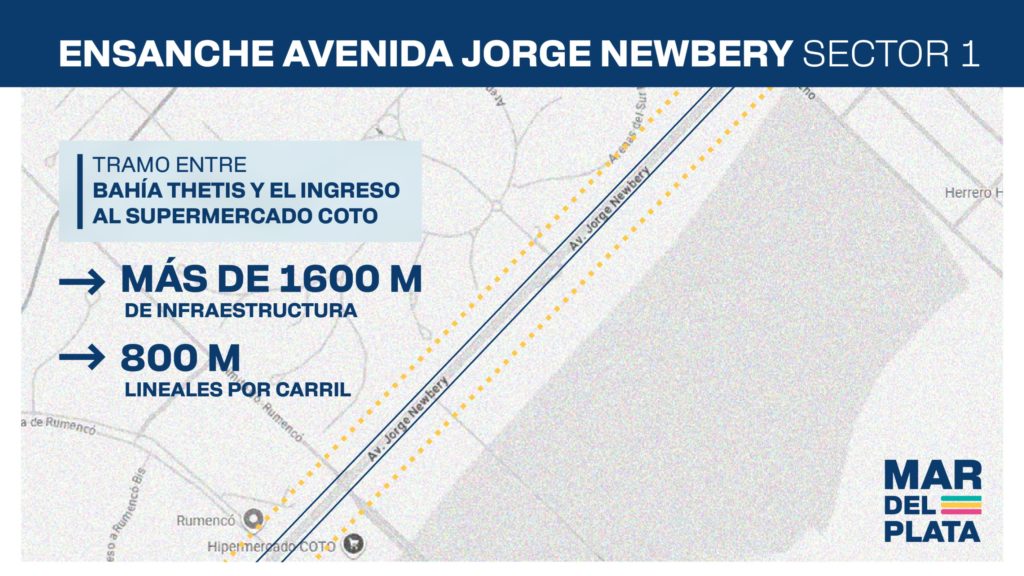La Municipalidad de General Pueyrredon, a través del Ente Municipal de Vialidad y Alumbrado Público (EMVIAL), informa que comenzaron los trabajos de ensanche sobre la avenida Jorge Newbery, en el tramo comprendido entre Bahía Tethis y el ingreso al supermercado Coto. Las obras son ejecutadas por una empresa constructora en conjunto con desarrolladores inmobiliarios y personal técnico de inspección y control de Vialidad Municipal. Es la primera de tres etapas.