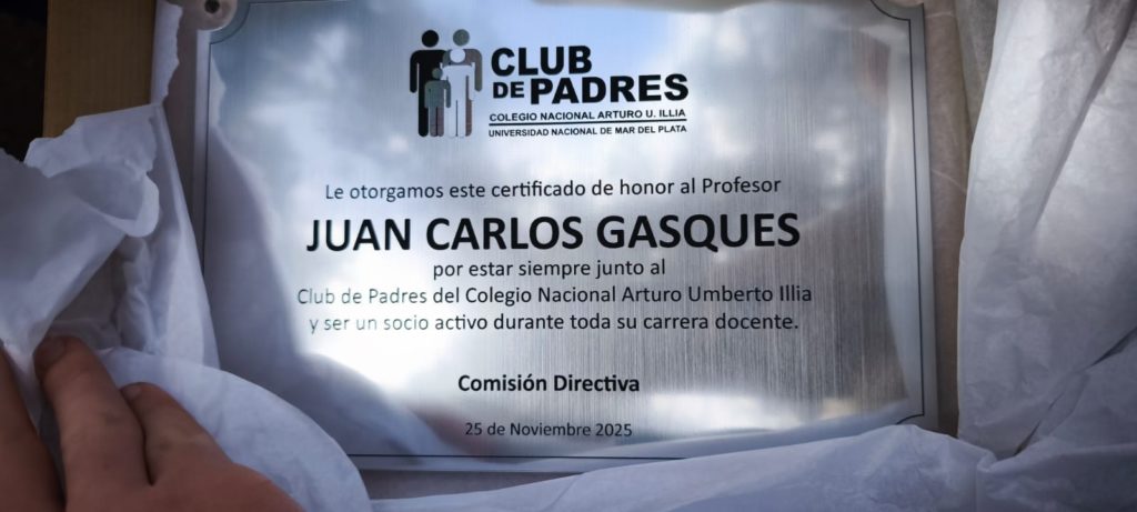 En el marco de la ceremonia de cierre del año lectivo 2025, el Club de Padres del Colegio Nacional Arturo Umberto Illia entregó un reconocimiento al docente Juan Carlos Gasques, quien se destacó por su dedicación y compromiso con la educación.