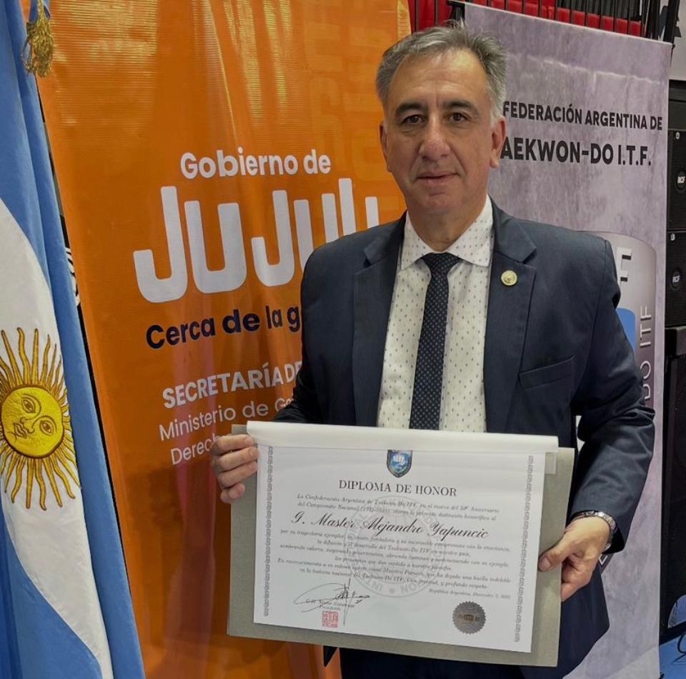 El maestro en artes marciale, Alejandro Yapuncic fue distinguido por la Confederación Argentina de Taekwondo ITF, en el marco de la ceremonia de apertura del Campeonato Nacional de la especialidad, realizado en la ciudad de San Salvador de Jujuy.