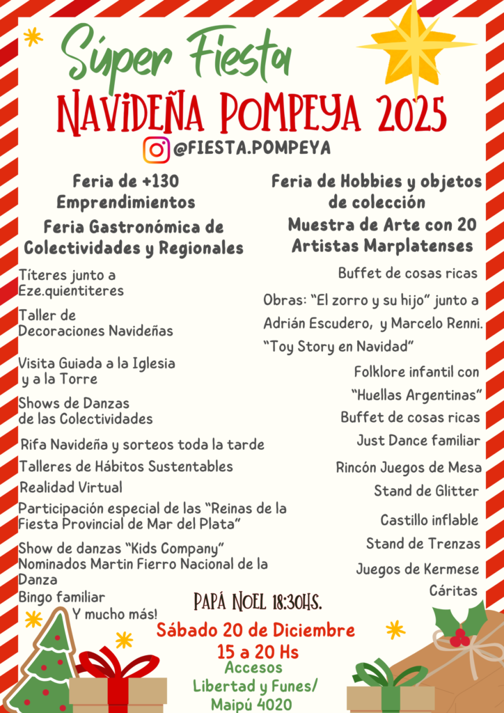 A modo de cierre anual, convoca con espíritu navideño y saliendo al encuentro de toda la comunidad marplatense, a una jornada festiva y con múltiples actividades familiares. Todos los fondos recaudados serán destinados para mejoras en la Iglesia; su Torre; y la escuela, señaló.