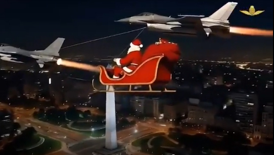 En el desenlace del video, el personaje agrega: “Ustedes son los verdaderos dueños del aire”, al tiempo que la animación muestra cómo los F-16 lo escoltan y luego toman el lugar de los renos, trasladando el trineo a gran velocidad sobre paisajes reconocibles, como el cielo de Buenos Aires y el Obelisco