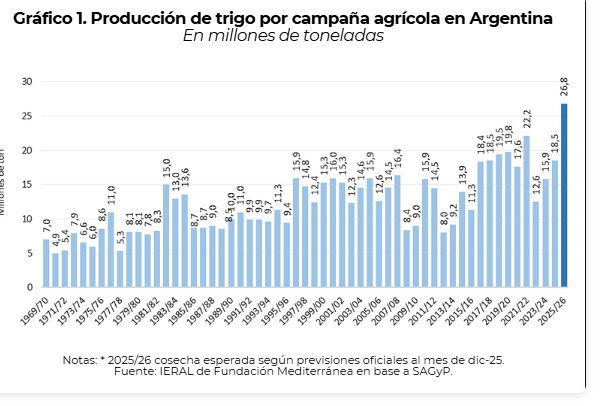 De acuerdo con las últimas estimaciones oficiales, la producción de trigo en Argentina rondaría los 27 millones de toneladas en la campaña 2025/26. Desde el punto de vista productivo, se trataría de un hito histórico por dos razones: por un lado, sería el mayor volumen desde que se llevan registros (1969/70); por otro, se alcanzaría gracias a rendimientos máximos del cultivo, con una superficie de siembra relativamente estable al nivel de los últimos años. Sin embargo, este récord físico no tendría su correlato comercial: el precio internacional del grano se ubica en mínimos del siglo y el ingreso de divisas por las exportaciones de trigo 2025/26 quedaría lejos de otros registros alcanzados en el pasado.