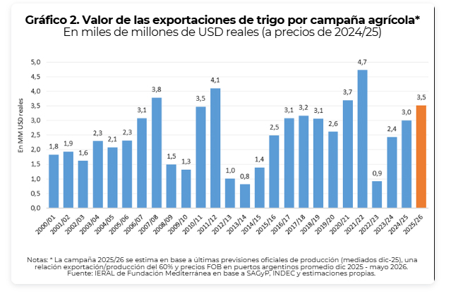 Teniendo en cuenta que alrededor del 65% de la producción se destinaría a la exportación (unos 17,5 millones de toneladas) y utilizando un precio medio en torno a USD 200 por tonelada de trigo para los embarques (promedio en base a FOB puertos argentinos, dic-25 a mayo-26), se estima un ingreso de divisas de USD 3,5 mil millones por las exportaciones de trigo en la campaña 2025/26.
