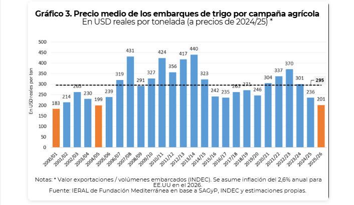 Como se mencionase anteriormente, el motivo de que el hito productivo no tenga su correlato en récord de divisas se encuentra en una floja coyuntura de precios para el cereal. Para tener orden de magnitud, en el gráfico 3 se observa que en 2025/26 el precio medio de las exportaciones de trigo constituiría el tercer peor registro en lo que va del siglo (casi empatado con 2004/05, solo algo mejor que en 2000/01) y guardaría una brecha negativa de más del 30% con respecto a su promedio histórico (USD 201 versus USD 295 por tonelada, respectivamente).