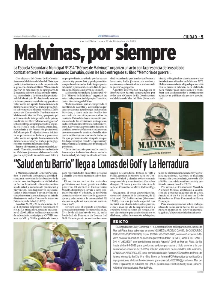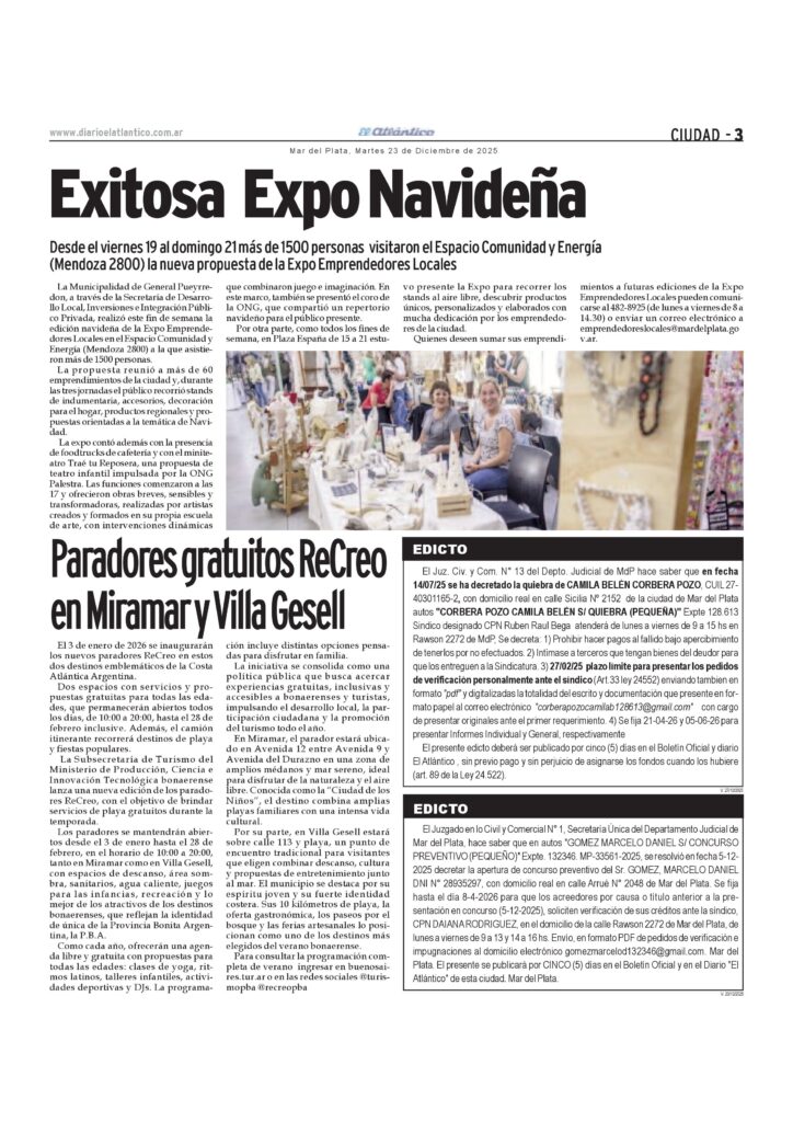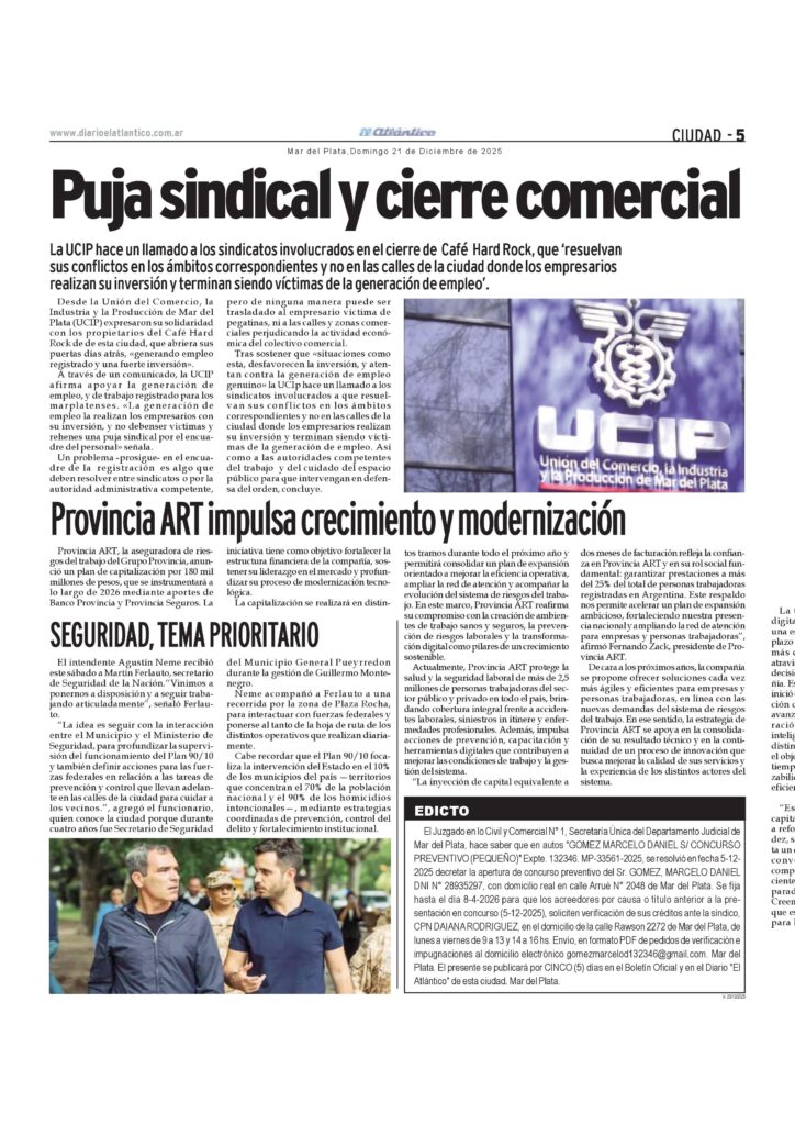 Comerciales Edicto: autos «Gómez Marcelo Daniel S/ Concurso Preventivo (Pequeño)» Expte. 132346. Mp-33561-2025 23 de diciembre de 2025 p5-edicto19-12-25-1de5Descarga p5-edicto20-12-25-2de5Descarga p5-edicto21-12-25-3de5_Descarga p5-edicto22-12-25-4de5FDescarga p3-edictos23-12-25-Gomez-5de5-Pozo1de5fDescarga Temas Relacionados Siguiente Edicto ciudadanía Oviedo Sosa Mariangela Josefina No te pierdas Edicto autos «JOSE DEYACOBBI SACI S/ QUIEBRA (DPTO. 20 DE SEPTIEMBRE 1856/62 PSO.6TO. B S/ ··INCIDENTE DE REALIZACION PARCIAL DE BIENES» Expte. N° 97989 Comerciales Convocatoria Obreros Empleados Panaderos Mar del Plata y Zona Atlántica p3-aviso9.2.26B-1Descarga Continuar Leyendo Comerciales Licitación Publica Nacional N° 1/2026 UNIHDO p7avisos-5.2.26b-2Descarga Continuar Leyendo Comerciales Convocatoria Unión de Educadores de General Alvarado p7avisos-5.2.26b-1Descarga Continuar Leyendo