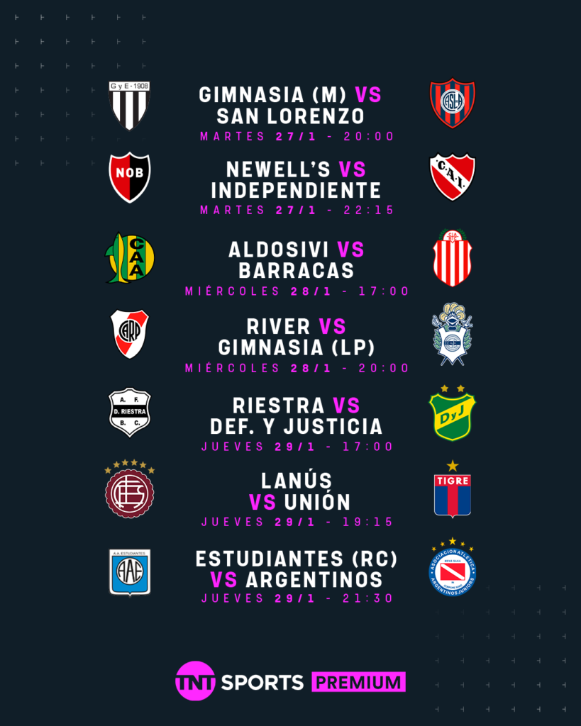 Este martes 27 de enero, la jornada se inaugura con el encuentro entre el recientemente ascendido Gimnasia de Mendoza frente a San Lorenzo, por la Zona A. La transmisión estará a cargo de Arturo Bulián en los relatos, con Matías Bustos Milla en los comentarios.