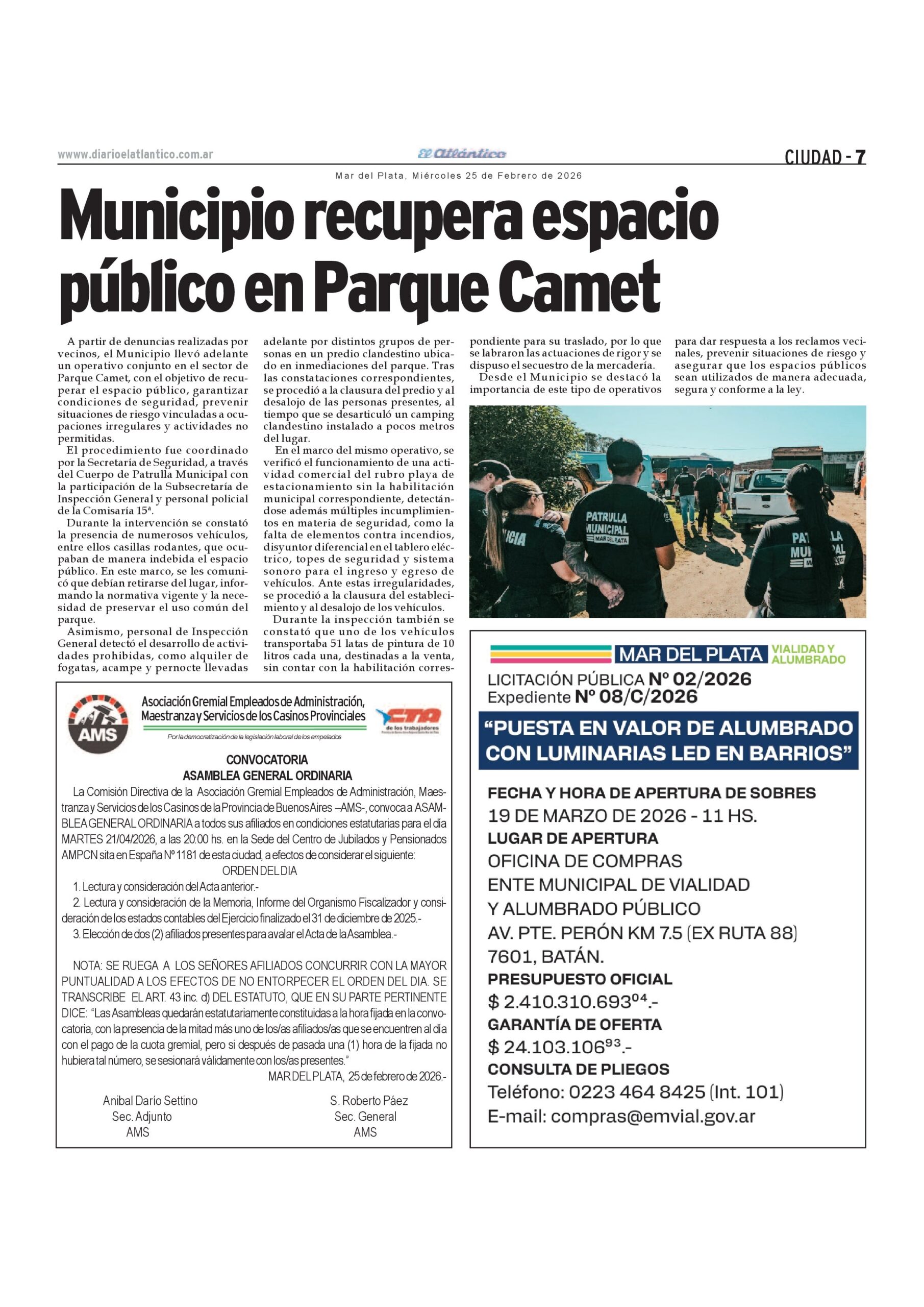 A partir de denuncias realizadas por vecinos, el Municipio llevó adelante un operativo conjunto en el sector de Parque Camet, con el objetivo de recuperar el espacio público, garantizar condiciones de seguridad, prevenir situaciones de riesgo vinculadas a ocupaciones irregulares y actividades no permitidas.