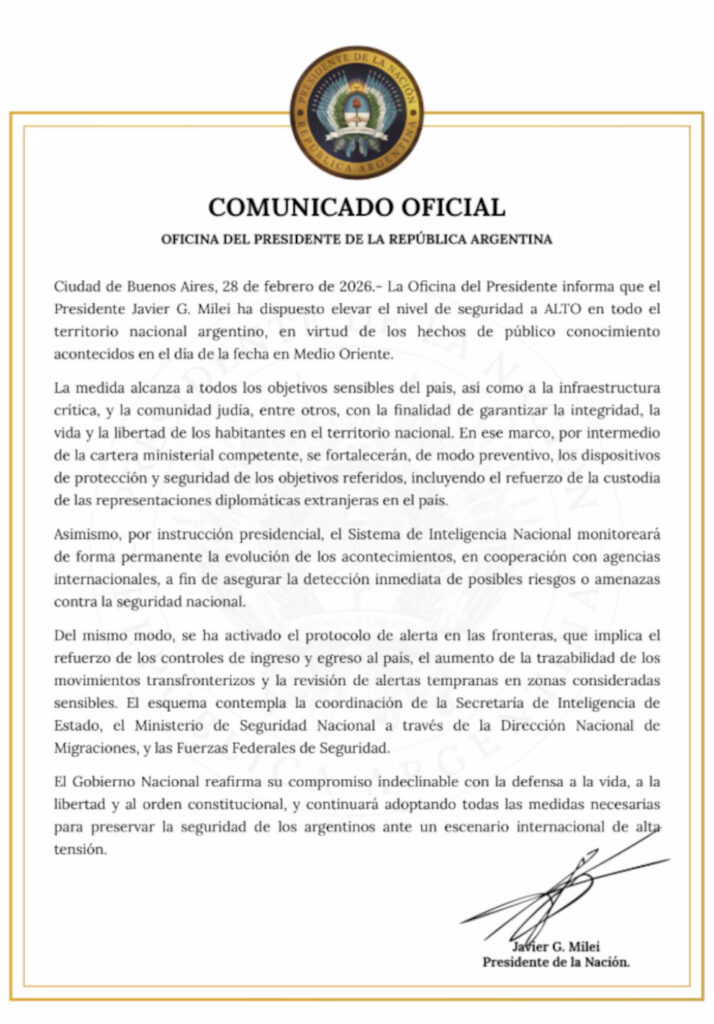 “Se ha activado el protocolo de alerta en las fronteras, que implica el refuerzo de los controles de ingreso y egreso al país, el aumento de la trazabilidad de los movimientos transfronterizos y la revisión de alertas tempranas en zonas consideradas sensibles. El esquema contempla la coordinación de la Secretaría de Inteligencia de Estado, el Ministerio de Seguridad Nacional a través de la Dirección Nacional de Migraciones, y las Fuerzas Federales de Seguridad”, agregaron.