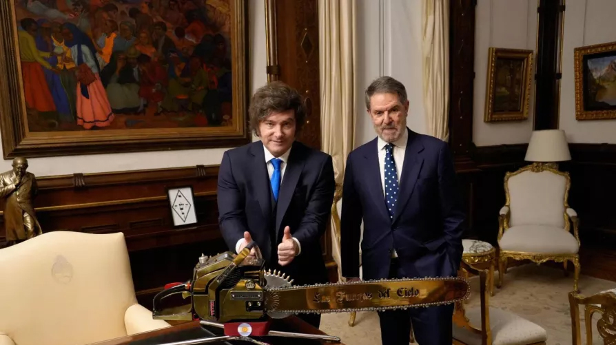 Foto: El periodista español Bieito Rubido y Javier Milei, en un momento de la entrevista, junto a la icónica motosierra (El Debate).