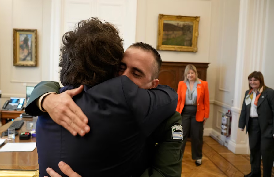 Y el mandatario aprovechó para obsequiarle una camiseta de la Selección Argentina, luego de que el efectivo contara que los captores, en el Rodeo I, le rayaban la bandera argentina que solía formar a diario con la fundición de los jabones celestes y blancos que recibía para higienizarse. “Era lo único que me hacía sentir que estaba en mi casa, en mi país, aunque me la hayan rayado varias veces, no importa, la volvía a hacer”, subrayó durante sus primeras declaraciones a la prensa.