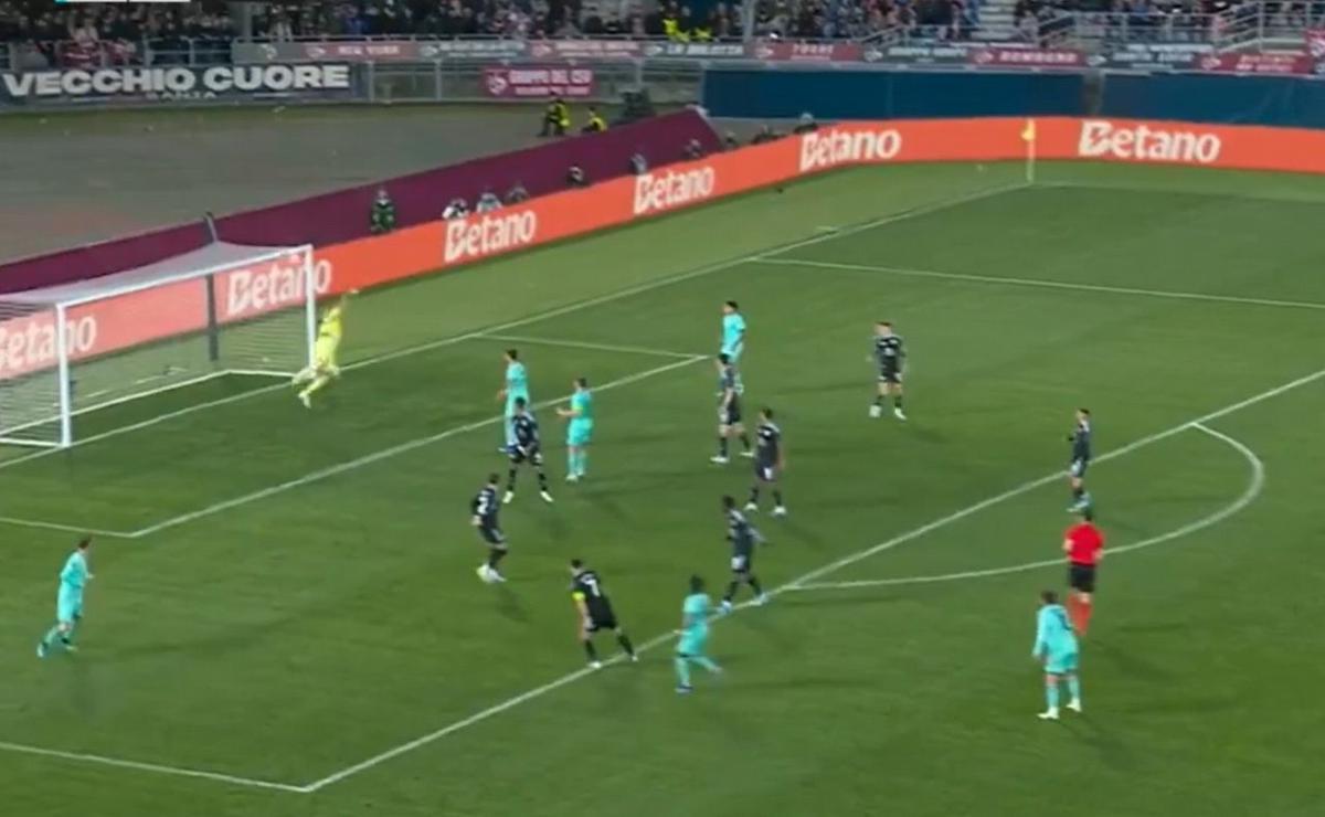 Tras la atajada del campeón del mundo, el delantero de Bologna reaccionó agarrándose la cabeza sin poder creer la atajada de Martínez.