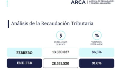 Un informe de la Agencia de Recaudación y Control Aduanero (ARCA) puntualizó que la recaudación llegó a $13,52 billones en febrero, lo que implicó un aumento del 86,5%...