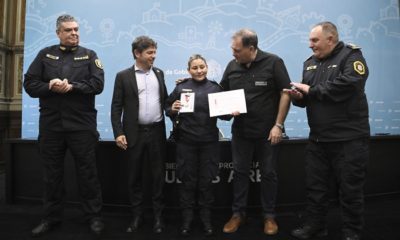 El gobernador Axel Kicillof encabezó junto al ministro de Seguridad, Javier Alonso, el acto de entrega de reconocimientos al mérito a 32 efectivos de la policía...
