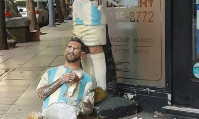 La estatua de Lionel Messi ubicada en la entrada del café El Nuevo Mundial, en la esquina de Moreno y Santa Fe, amaneció este domingo partida a la mitad. La...